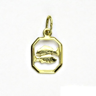 Přívěsek ze žlutého zlata - znamení zvěrokruhu ryby. Materiál je zlato 585/1000. Rozměr přívěsku je 18 mm včetně očka na výšku a 10 mm na šířku. Orientační váha přívěsku je 0,66 g.