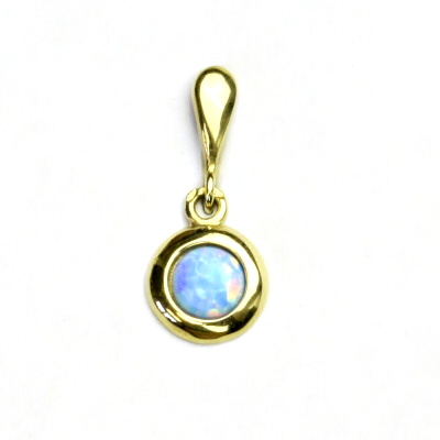Přívěsek ze žlutého zlata je zdoben sv. modrým syntetickým opálem o průměru 5 mm. Materiál je zlato 585/1000. Orientační váha přívěsku je 0,93 g. Rozměr přívěsku je 19 mm včetně úchytu na výšku a 8 mm na šířku.