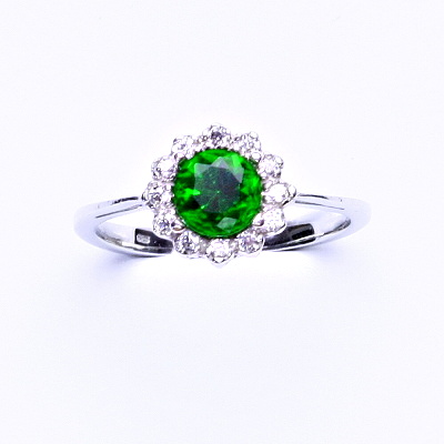 Elegantní zlatý prsten ve stylu populárního modelu Kate zdobený zirkonem smaragd o průměru 5,5 mm a zirkony čiré barvy zasazenými po jeho obvodu. Materiál, z něhož je šperk vyhotoven, je bílé zlato ryzosti 585/1000. Orientační hmotnost prstenu při velikosti 65 je 2,33 g, průměr kamene 5,5 mm.